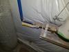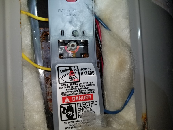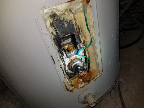 The water heater has corrosion inside the casing; this may be due to leaking. The contacts are rusted; this is a safety hazard. Recommend making repairs or replacing the water heater.