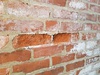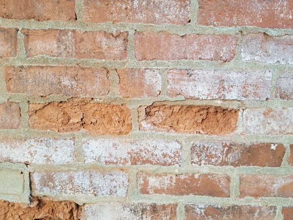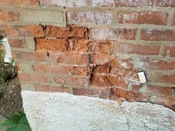 There is damaged and spalling brick on the exterior wall. Recommend repairing the brick to prevent further deterioration and damage.